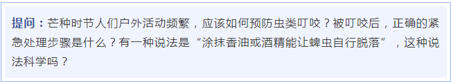 芒種時(shí)節(jié)戶外活動(dòng)需要警惕蚊蟲(chóng)、蜱蟲(chóng)、恙螨和隱翅蟲(chóng)等侵襲。蜱蟲(chóng)吸附皮膚,吸血后體積非常大,往往超過(guò)它們身體的5倍以上,它的唾液里往往攜帶多種導(dǎo)致萊姆病、森林腦炎、發(fā)熱伴血小板減少綜合征等疾病的病原體;恙螨幼蟲(chóng)藏在草葉腐土中,人被叮咬后,皮膚上會(huì)形成綠豆大小的紅腫水泡,中間可能有焦痂;隱翅蟲(chóng)體液接觸皮膚會(huì)引起條狀潰爛。這些蟲(chóng)子在氣溫25攝氏度、濕度80%的潮濕環(huán)境中最活躍,尤其喜歡棲息在高草區(qū)、灌木叢和積水附近。