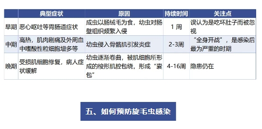 成蟲(chóng)期:成蟲(chóng)會(huì)在人體的小腸中停留幾周甚至幾個(gè)月來(lái)“產(chǎn)子”(卵胎生)。產(chǎn)出的幼蟲(chóng)“寶寶”穿透腸壁,隨著血液和淋巴系統(tǒng)擴(kuò)散到全身肌肉中,形成“囊包”。