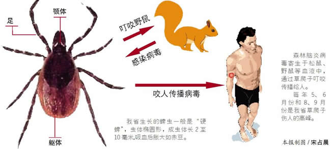 省森工總醫(yī)院神經(jīng)內(nèi)科主任呂首旭說,今年,醫(yī)院門診收治的草爬子咬傷患者已有三四百人,比去年增多了近一倍。以往被草爬子咬傷的大多是林區(qū)工作者和上山采摘的農(nóng)民,今年旅游踏青受傷的患者明顯增多?!安菖雷訉W(xué)名蜱蟲,樹多草多的地方就可能有,除了林區(qū)、山區(qū)外,今年還收治到在市區(qū)草叢茂盛的地方被草爬子咬傷的患者,因此市民在草叢里行走時(shí)要格外當(dāng)心。”呂首旭提醒。