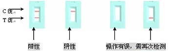 陰性:判定部(T)處沒有出現(xiàn)紫紅色條帶,只是在判定部(C)處出現(xiàn)紫紅色條帶。